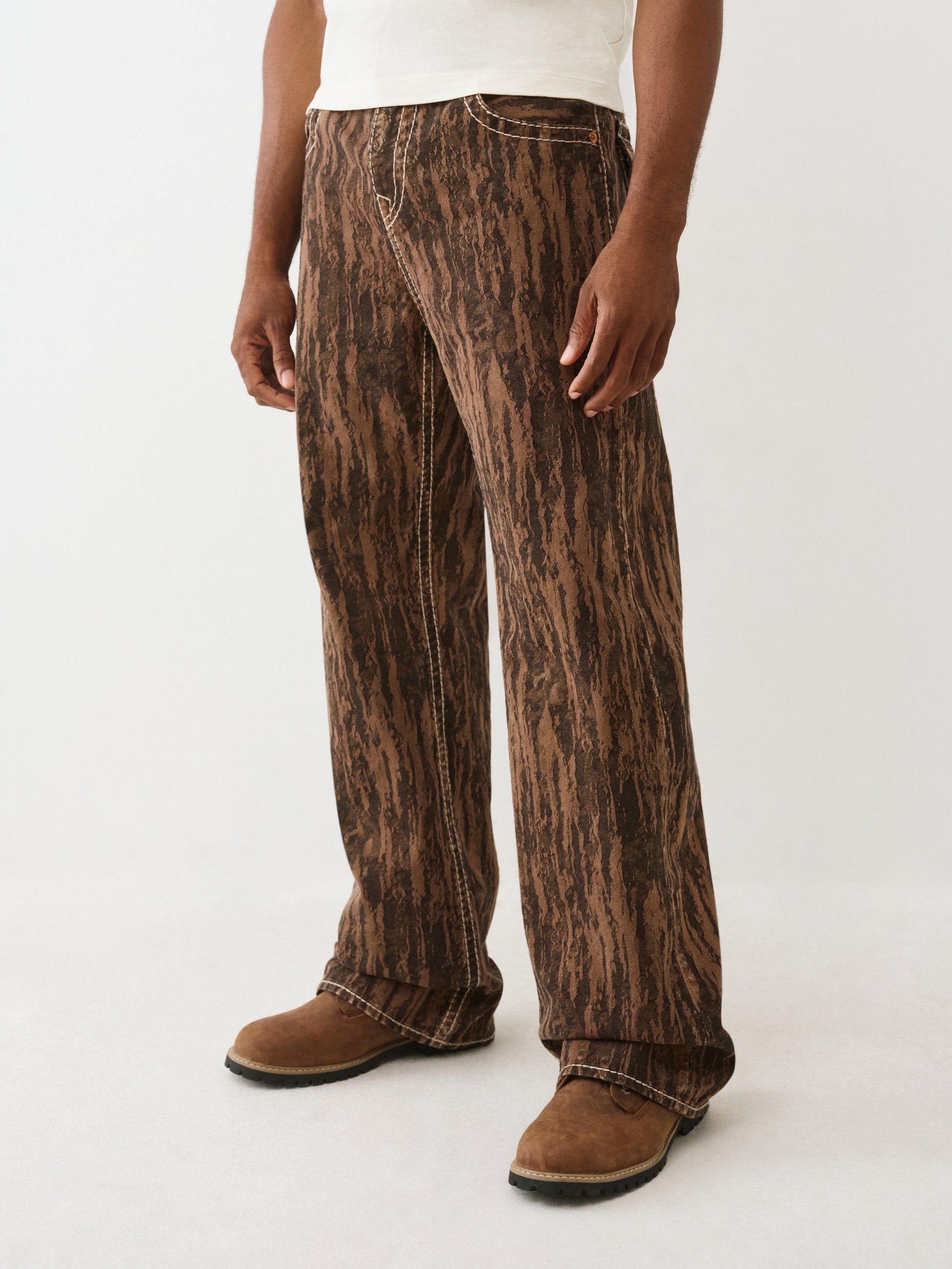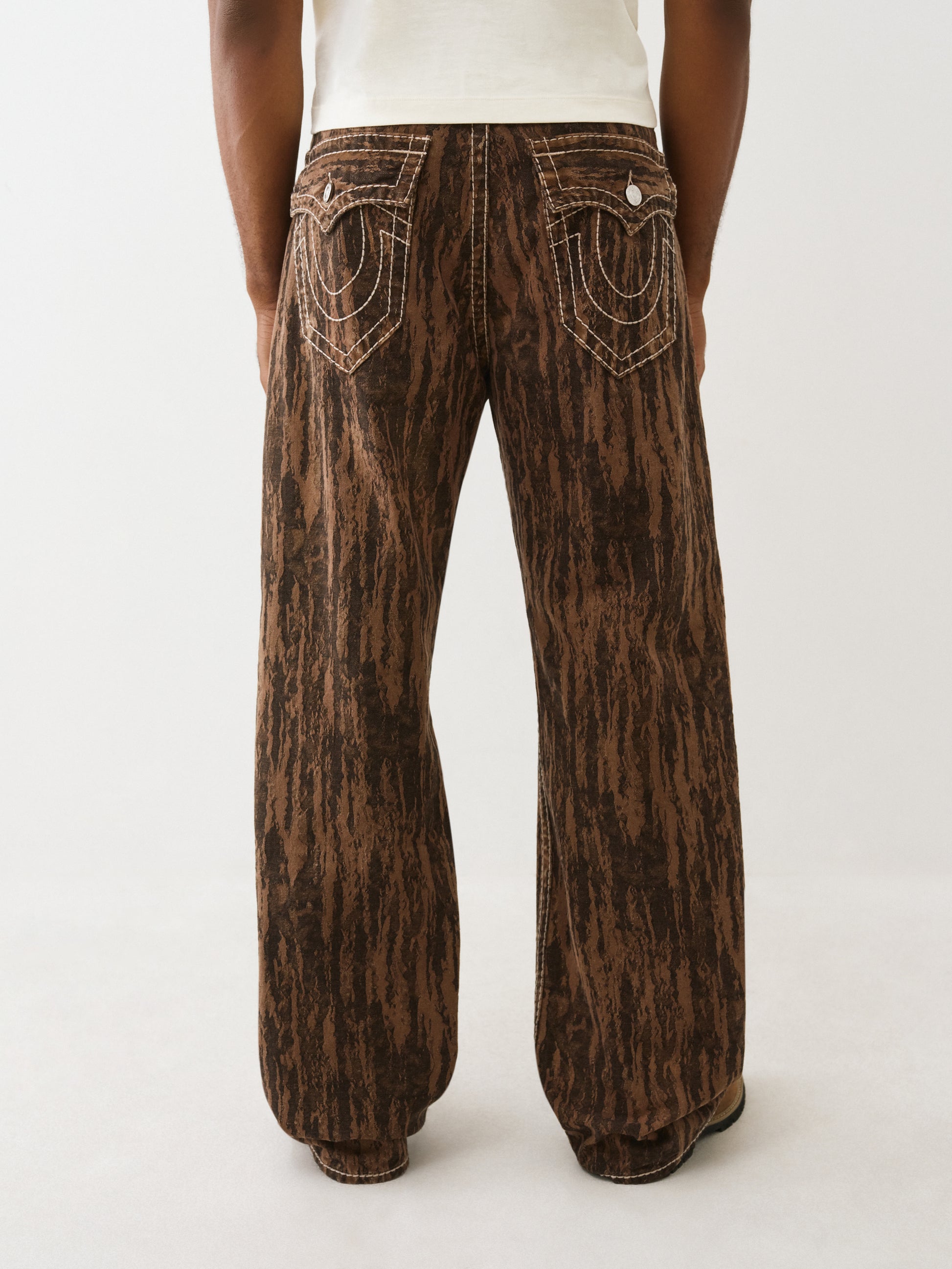 Mantén los pies en la tierra con los jeans Vinny Wood Print Big T Ultra Baggy. Sueltos en la pierna, estos jeans presentan un estampado integral de vetas de madera, costuras Big T, herrajes en tonos cobre y herraduras cosidas en los bolsillos traseros con solapa.