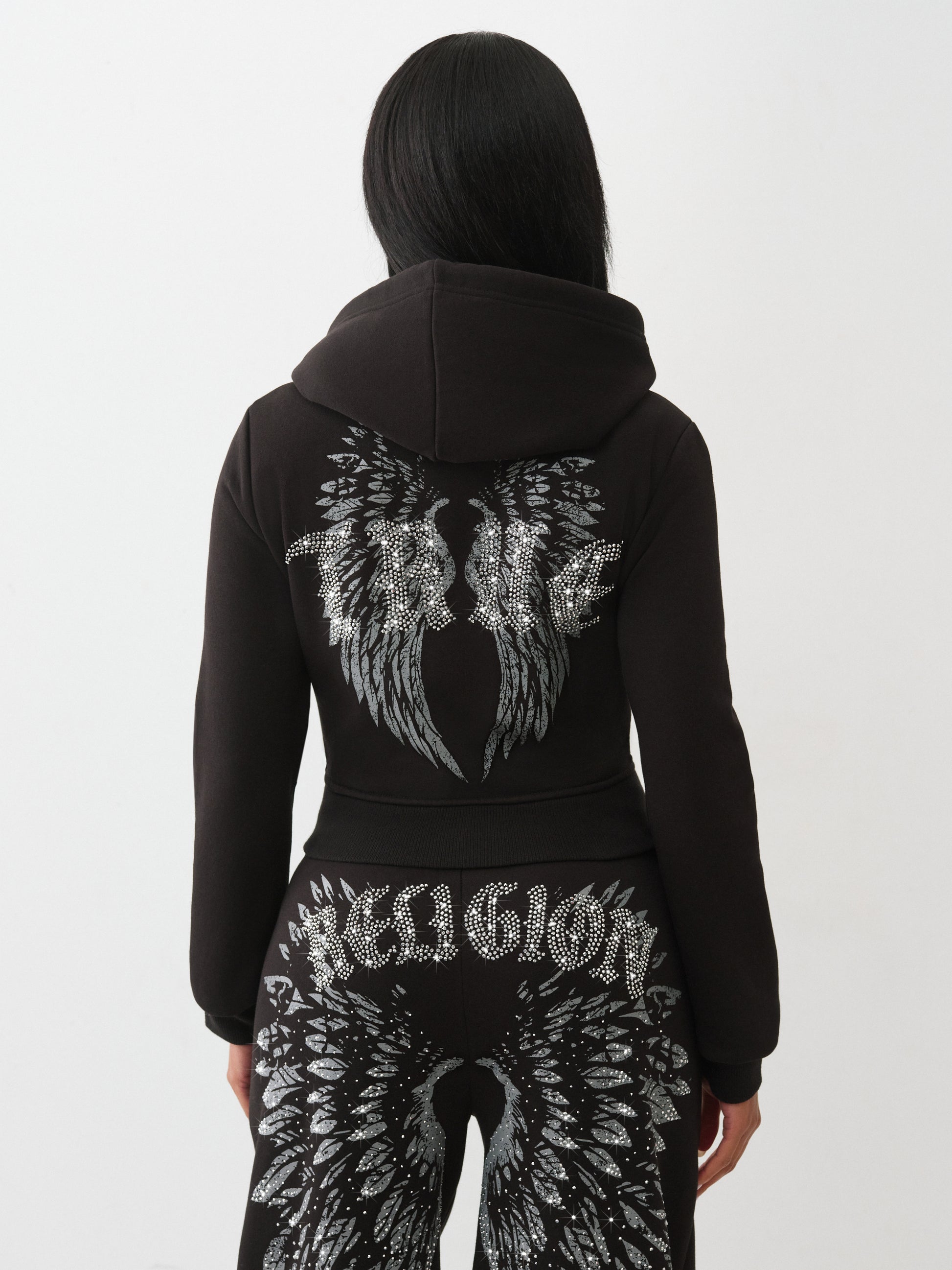 Atrapa la luz, sigue las vibraciones. La sudadera con capucha Crystal Wing Shrunken Zip presenta un corte corto, el logo de la herradura de cristal en el pecho, bolsillos tipo canguro divididos y un logo brillante sobre un gráfico alado en la espalda.